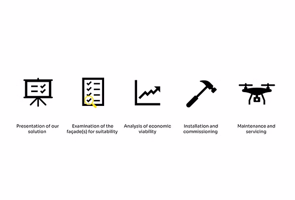 We offer our customers a turnkey solar facade - from the initial concept to the purchase of components and installation. Our customers do not have to worry about the analysis of the existing surfaces, the supply chain, or the installation. We take care of the whole package.